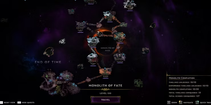 Вы также можете получить доступ к Монолиту судьбы в любое время с вашей карты. Все разблокированные временные линии можно найти под временной линией "Конец времени".