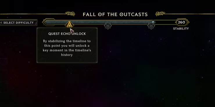 Каждый раз, когда вы очищаете Эхо в Монолите времени, стабильность вашей текущей временной шкалы увеличивается. Стабильность позволяет вам получить доступ к квестовым эхо в текущей временной линии. Для каждой временной линии существует три квест-эхо, первые два служат предварительным условием для разблокировки боя с боссом этой временной линии. Третий квест Эхо всегда будет боем с боссом.