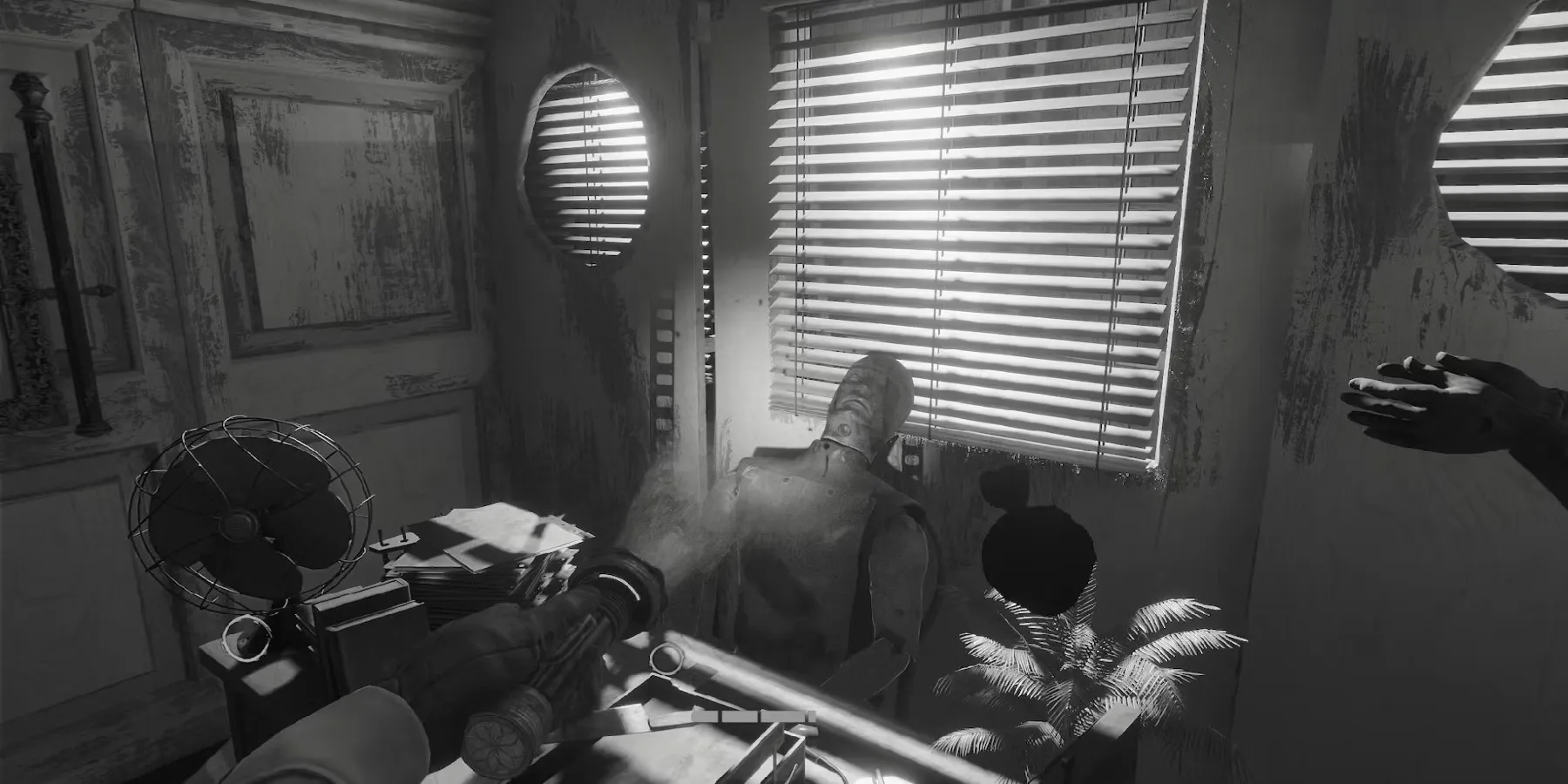 После прохождения этапа на пиратском корабле в Layers of Fear (2023) следуйте по меловым стрелкам на полу через дверь в коридор с занавесом. Цвет будет исчезать из игры по мере приближения игроков к занавесу. За занавесом игроки найдут на столе слева письмо от столярной компании о деревянном ящике, "достаточно большом, чтобы вместить взрослого мужчину", и радиоприемник на табурете справа, который можно выключить.