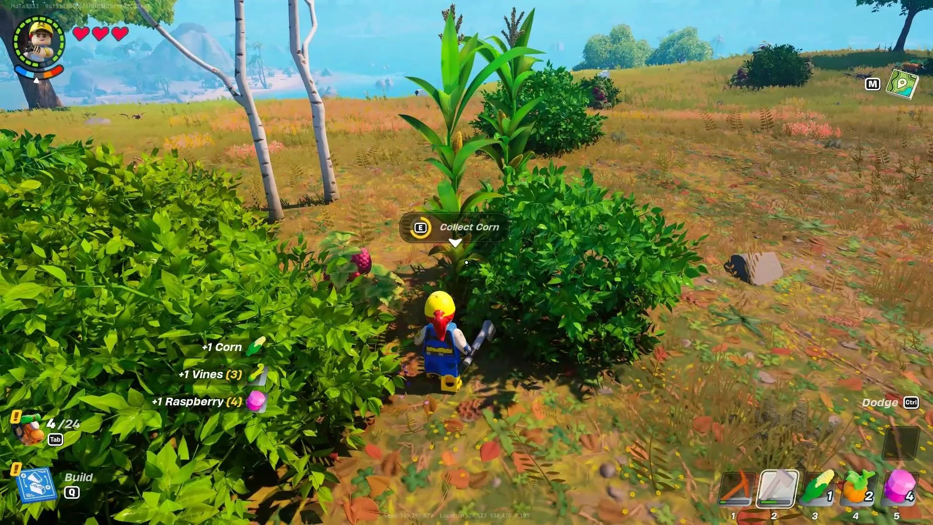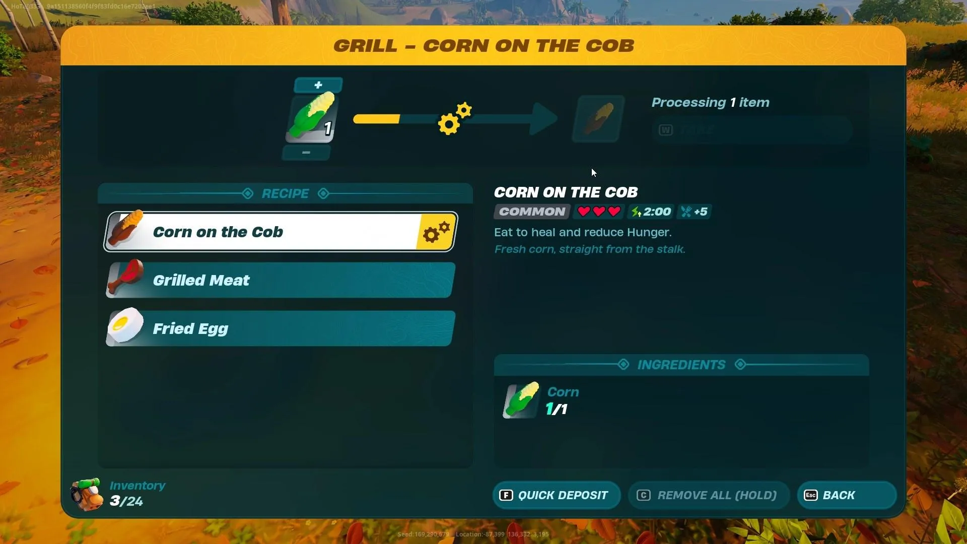 После того как вы поставили гриль на землю и потратили 30 гранита, соберите несколько ингредиентов. Проще всего найти кукурузу, которая находится в ближайших кустах.