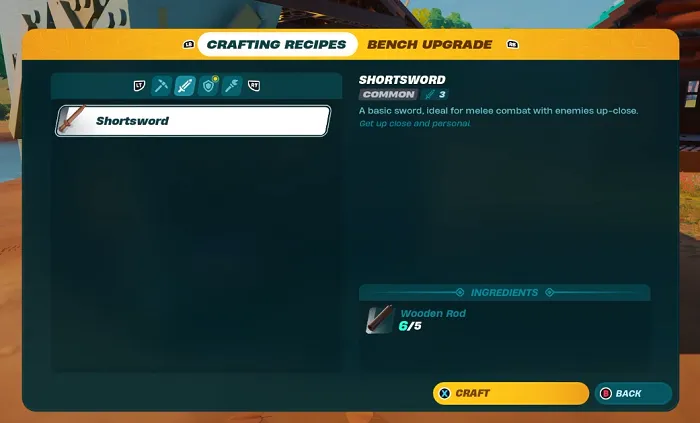 Собрав верстак, откройте список рецептов и выберите Shortsword.