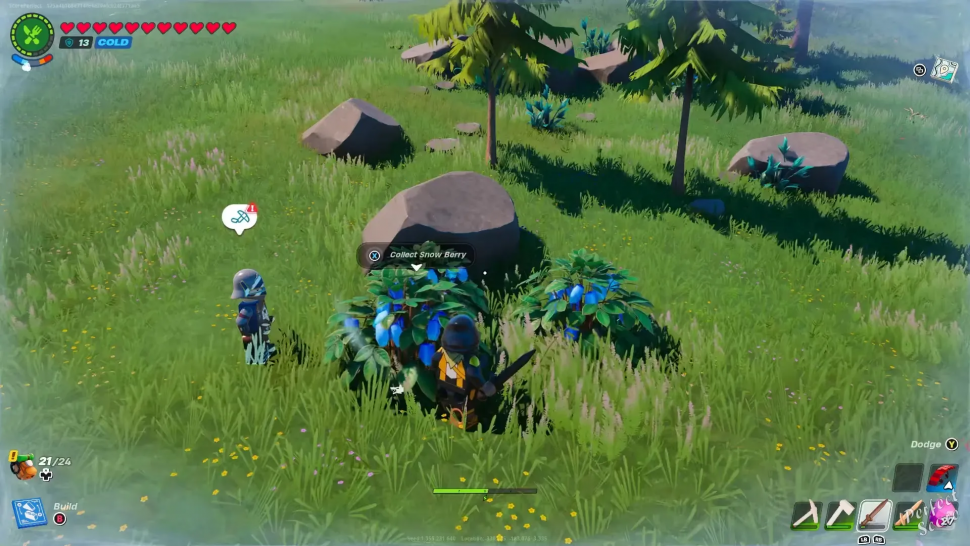 Отправляйтесь в снежный биом в LEGO Fortnite, где вы сможете найти ягоды снежноягодника. Кусты снежной ягоды, которые можно узнать по слабому свечению и голубому цвету, расположены у границы биома. Соберите их как можно больше; для предстоящего рецепта вам понадобятся 2 ягоды.
