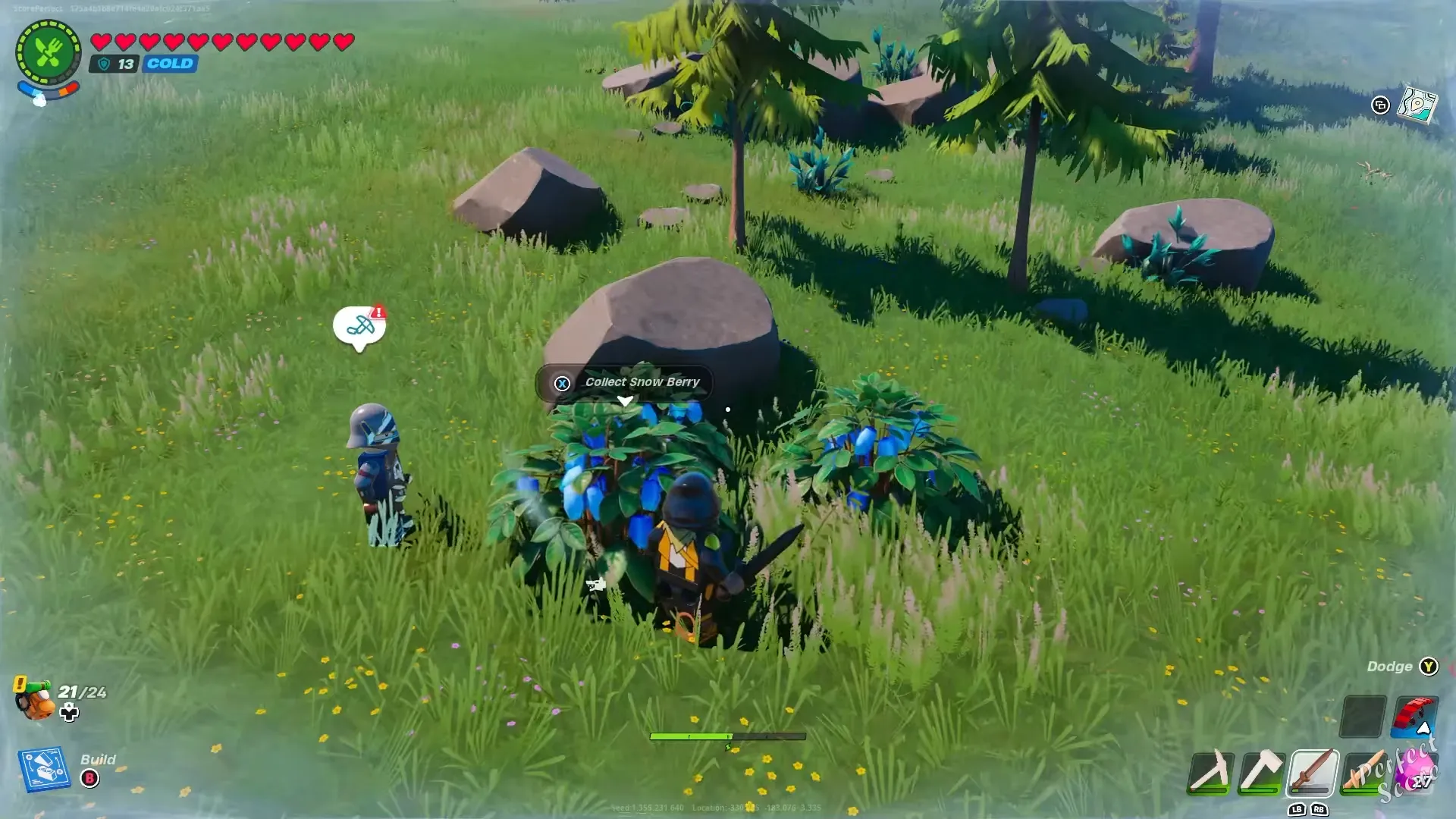 Отправляйтесь в снежный биом в LEGO Fortnite, где вы сможете найти ягоды снежноягодника. Кусты снежной ягоды, которые можно узнать по слабому свечению и голубому цвету, расположены у границы биома. Соберите их как можно больше; для предстоящего рецепта вам понадобятся 2 ягоды.