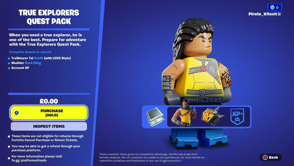 Игроки Fortnite любят халяву, и сейчас в магазине можно бесплатно получить целый квест-пакет. В квест-пакете True Explorers вы получите скин Trailblazer Tai Outfit (как в обычной, так и в Lego-версии), Skullder Back Bling и кучу XP. Если у вас еще нет учетной записи, вы можете рассмотреть возможность приобрести Аккаунты Fortnite для быстрого старта.