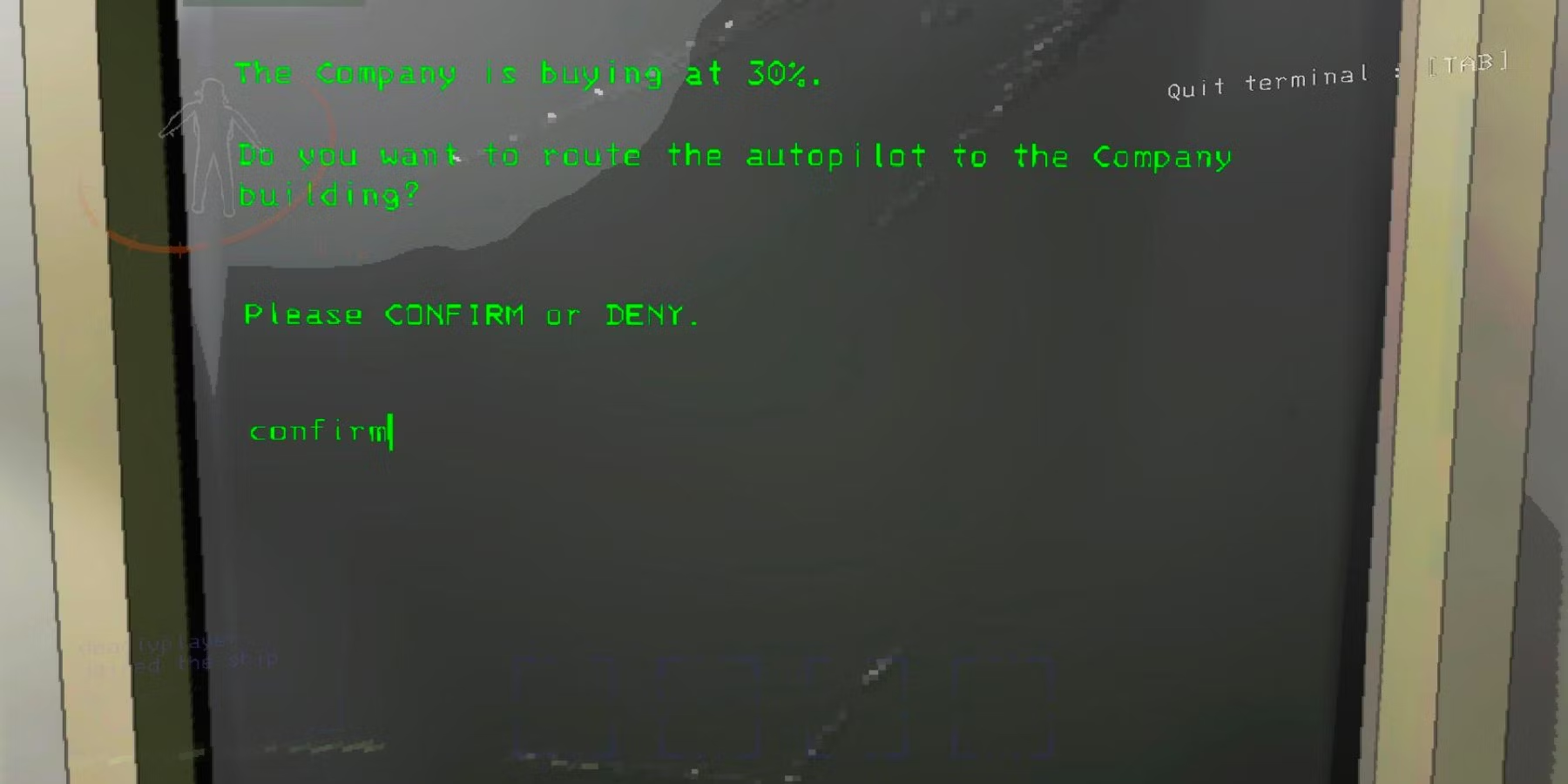 Приземлившись на корабль, они попадут на луну Компании, куда игроки обычно отправляются, чтобы продать металлолом. Выйдя из корабля, игроки должны начать идти налево, в сторону зоны, где можно найти полезные гаджеты, например фонарики и рации. Игроки должны следить за люком на земле; обычно он находится перед автоматом по доставке предметов.