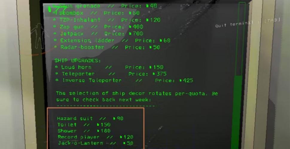 Хотя работа в Lethal Company может быть связана с определенным риском, вы можете сделать ее немного лучше, украсив корабль мебелью, которую вы приобретете в официальном магазине Компании в терминале. Однако эти предметы просто размещаются на вашем корабле, и вы можете захотеть передвинуть их, чтобы улучшить фэн-шуй.