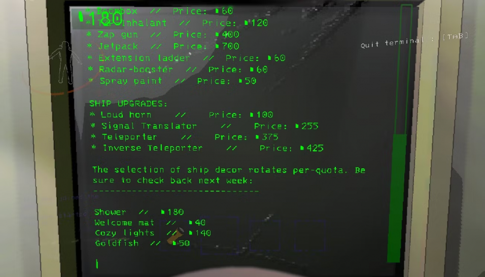 Снаряжение и модернизация корабля необходимы для выживания в Lethal Company, но это не значит, что вы не можете повеселиться и украсить свой корабль. На корабле есть множество предметов, которые можно добавить, например старый телевизор или душ, чтобы было удобно смывать с себя кровь.