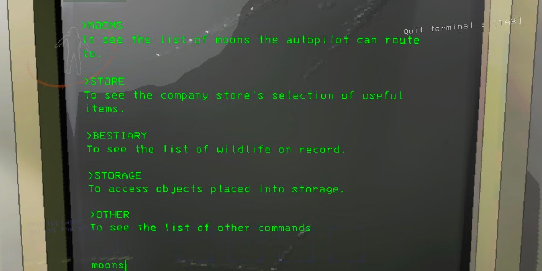 На экране появится список всех лун и погодные условия на каждой из них на конкретный день. Игроки могут отправиться на нужную им луну, введя ее название в терминал на корабле.