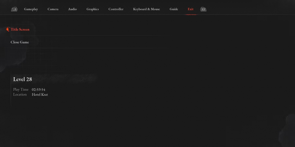 В этой категории есть две опции: Title Screen или Close Game. Первый вариант соответствует своему названию: выбрав его, игрок попадает на титульный экран, где может изучить дополнительные настройки или полностью выйти из игры, нажав кнопку Close Game. Вторая опция аналогична первой с той лишь разницей, что Lies of P закрывается, а игроки не переходят на экран заголовка.