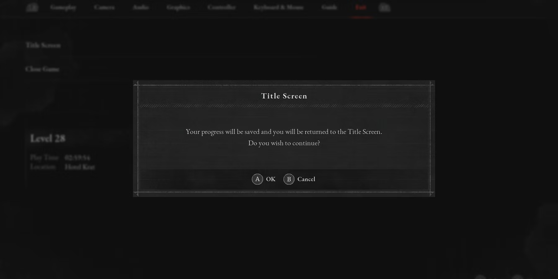 В этой категории есть две опции: Title Screen или Close Game. Первый вариант соответствует своему названию: выбрав его, игрок попадает на титульный экран, где может изучить дополнительные настройки или полностью выйти из игры, нажав кнопку Close Game. Вторая опция аналогична первой с той лишь разницей, что Lies of P закрывается, а игроки не переходят на экран заголовка.