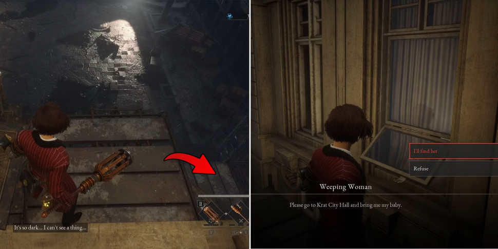 Пройдите вперед, чтобы найти квадратную площадку и силуэт женщины на окне, расположенном справа возле деревянной платформы. Спрыгните вниз и подойдите к окну, чтобы поговорить с Плачущей женщиной и принять задание по поиску ее потерянного ребенка.