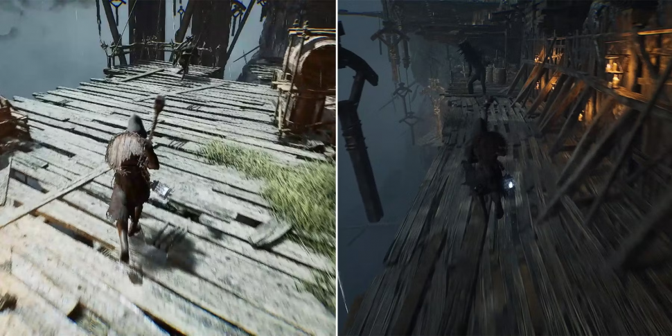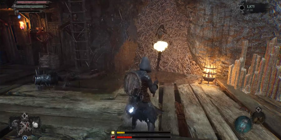 Выйдите из комнаты, заставленной ящиками, и поднимитесь по лестнице, чтобы попасть на вращающуюся деревянную платформу. Дождитесь, когда она повернется в нужную сторону, и быстро перепрыгните на платформу. Перепрыгните на другую сторону и добегите до конца длинной деревянной платформы. В Lords of the Fallen избегайте или побеждайте большого врага, а затем используйте лестницу, чтобы скользить вниз.