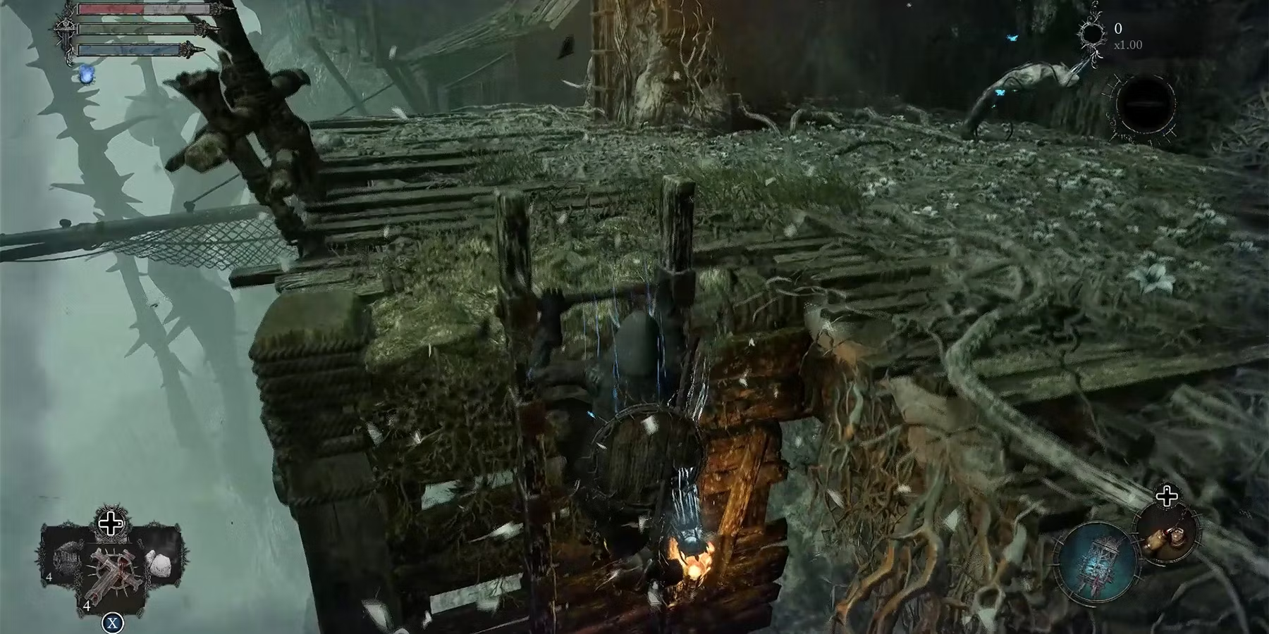 Выйдите из комнаты, заставленной ящиками, и поднимитесь по лестнице, чтобы попасть на вращающуюся деревянную платформу. Дождитесь, когда она повернется в нужную сторону, и быстро перепрыгните на платформу. Перепрыгните на другую сторону и добегите до конца длинной деревянной платформы. В Lords of the Fallen избегайте или побеждайте большого врага, а затем используйте лестницу, чтобы скользить вниз.