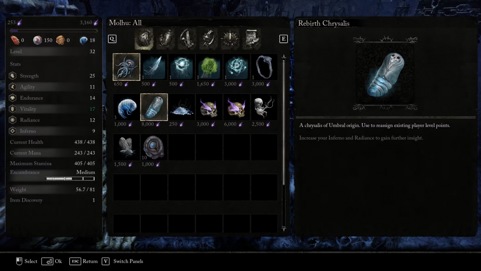 Отнесите куколку Возрождения обратно Пиете, чтобы начать процесс перестройки. Это можно сделать только один раз, и для повторного обновления игроку придется приобрести еще одну у Молху. Недостатком здесь является то, что одна куколка возрождения стоит 8 000 Вигор, что очень дорого на начальном этапе игры. Однако это очень удобно для игроков, которые хотят попробовать билды, недоступные для их начального класса.