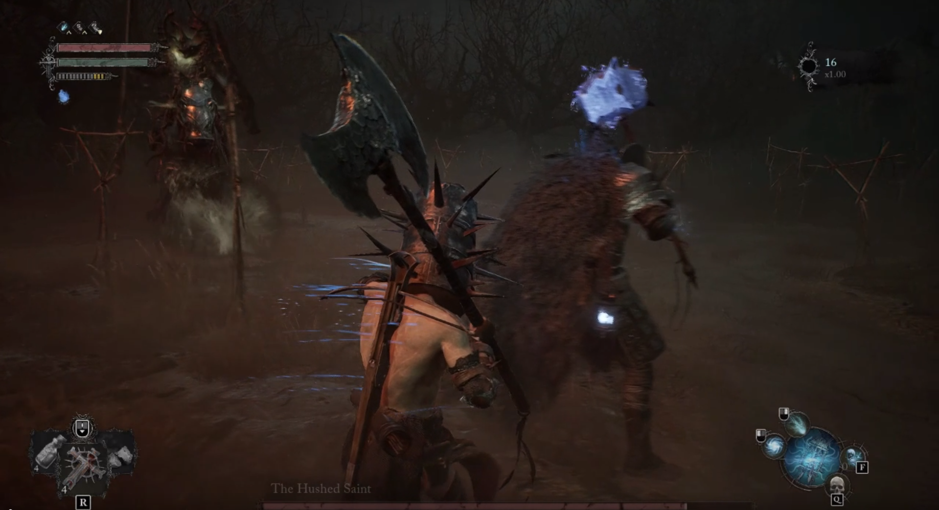 Когда босс находится на земле, Hushed Saint сражается с помощью щита и алебарды. От его атак довольно легко уклониться и парировать, но эти возможности по нанесению урона довольно ограничены. Вскоре он погрузится под воду и снова появится на своей лошади. Снова сбейте его с лошади и повторяйте эту процедуру до тех пор, пока он не умрет.