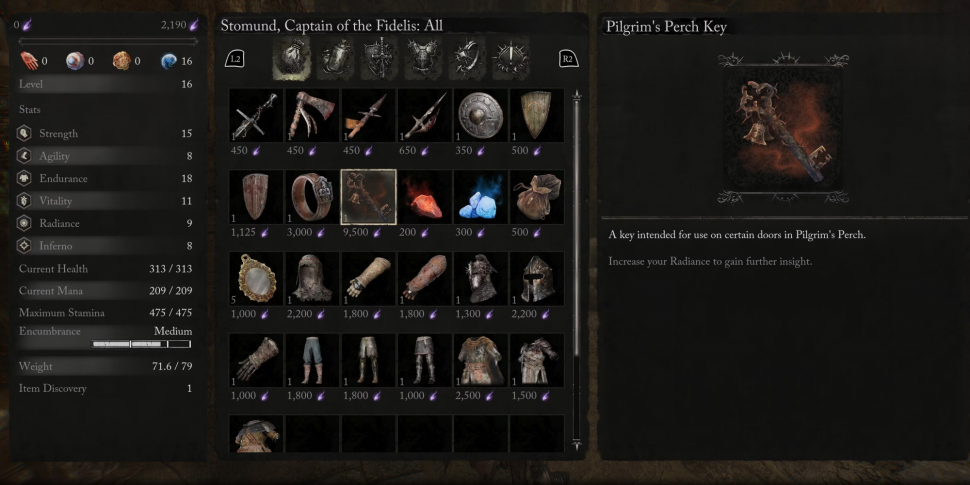 Найдя мост Skyrest, поговорите со Стомундом. Выберите опцию "Приобрести". Просматривая его инвентарь, игроки найдут множество предметов, одним из которых является Ключ для паломника (Pilgrim's Perch). Этот предмет можно приобрести за 9 500 Вигор. При первой встрече со Стомундом у большинства игроков не будет необходимого запаса энергичности, поэтому для его приобретения придется немного потрудиться. К счастью, у них должно быть разблокировано несколько точек Vestige. Отправляйтесь к той из них, возле которой много врагов, убейте их всех, а затем восстановите силы, отдохнув в точке Vestige.