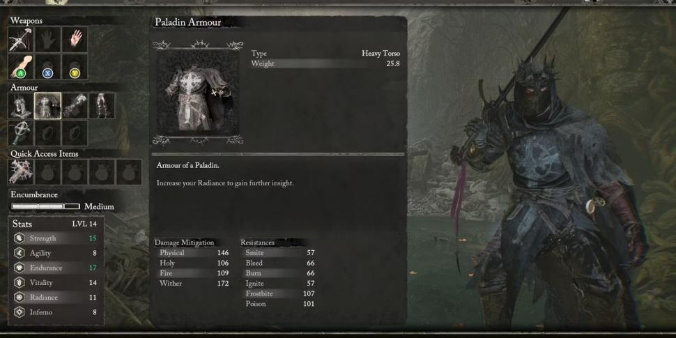 Доспехи Темного Крестоносца - это, по сути, набор тяжелой экипировки паладина, направленной на увеличение сияния и защиту. Она состоит из тяжелых доспехов на ногах под названием Paladin Leggings, тяжелого торса Paladin Armor, перчаток Paladin Gauntlets в качестве тяжелых наручей, тяжелого головного убора под названием Helm of the Paladin и кулона Paladin's Pendant, который увеличивает атрибуты Strength и Endurance.