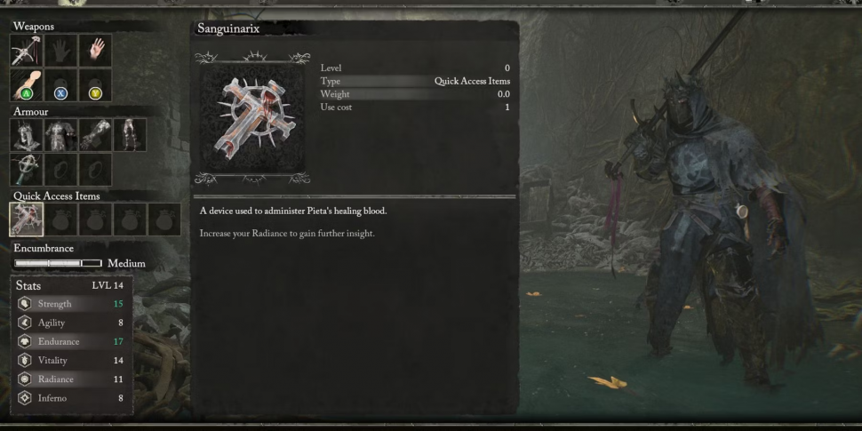 Как и другие начальные классы, Темный Крестоносец получает Умбральную лампу, которая позволяет игроку перемещаться между царствами живых (Аксиома) и мертвых (Умбрала) и воскресать после смерти. Однако темные крестоносцы также получают модернизируемый "Сангинарикс" (Lords of the Fallen) - предмет быстрого доступа, используемый для введения целебной крови Пьеты. Это расходный материал, который, по сути, является основным способом сохранения здоровья.
