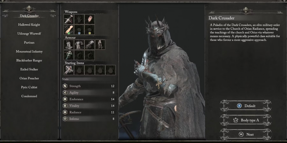 Темный крестоносец - это класс паладинов, ориентированный на силу, с экипировкой, ориентированной на игру с длинным мечом и сияние. Он также обладает характеристиками, ориентированными на силу и живучесть, и включает в себя следующее оружие, броню и предметы быстрого доступа: