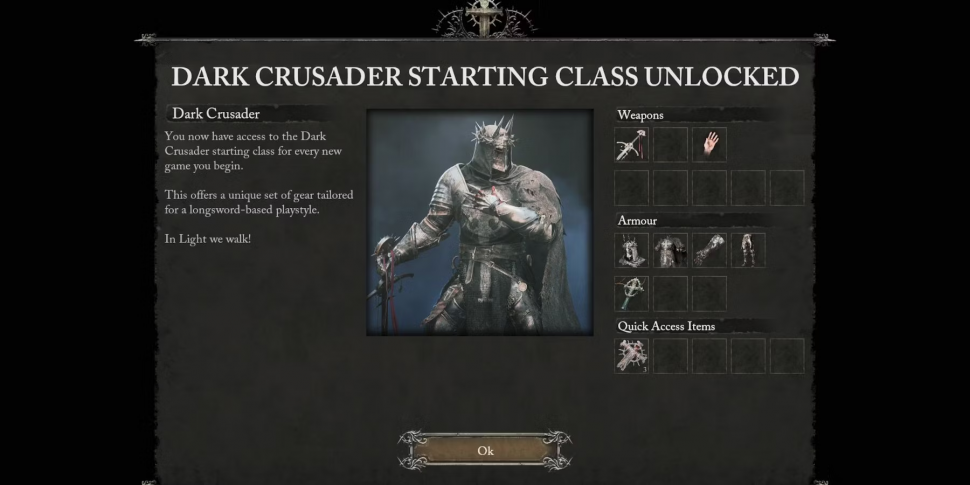 Те игроки, которые предпочитают начинать игру в стиле Souls с меньшего, могут решить подождать и разблокировать класс Dark Crusader в игре, особенно те, кто планирует пройти игру не один раз. Тем не менее, темный крестоносец имеет некоторые преимущества, которыми могут воспользоваться начинающие игроки Soulslike, например, более высокий уровень жизненной силы и длинный меч для поддержания дистанции, а также тяжелая, как у танка, мощная броня.