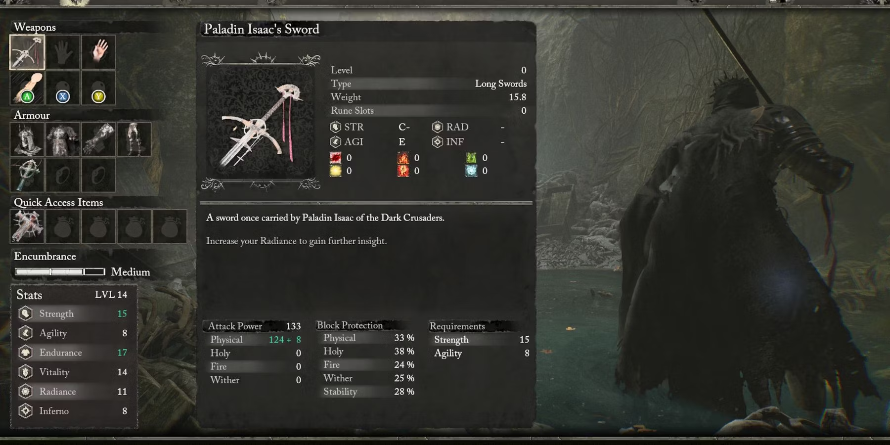 Темный крестоносец - это класс паладинов, ориентированный на силу, с экипировкой, ориентированной на игру с длинным мечом и сияние. Он также обладает характеристиками, ориентированными на силу и живучесть, и включает в себя следующее оружие, броню и предметы быстрого доступа: