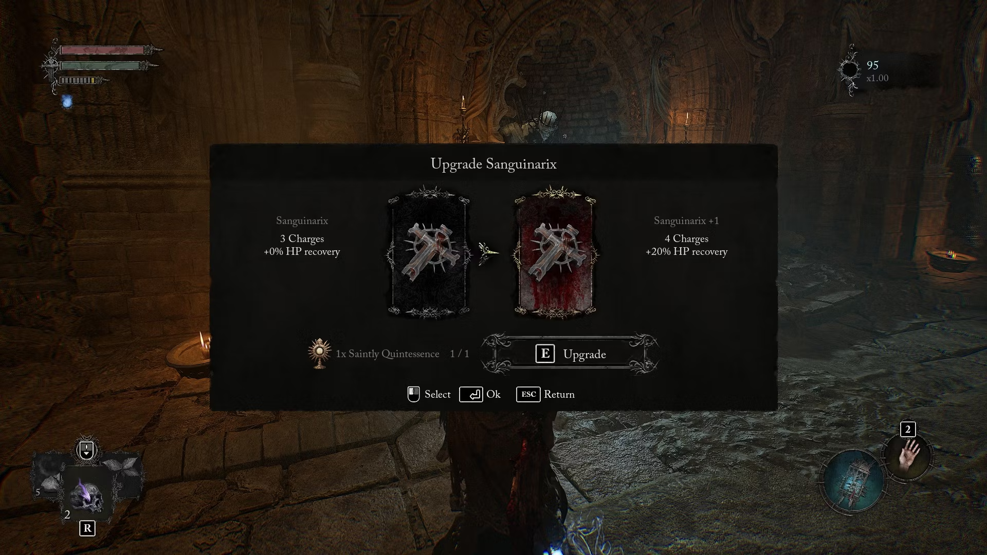 Завершить игру, ни разу не модернизировав Сангвинатрикс, вполне возможно, хотя это часто делается в сложных заданиях. Больше зарядов исцеления всегда приветствуется, а тот факт, что святые квинтэссенции также повышают силу исцеления Сангинатрикс, является приятным изменением привычной формулы Souls, в которой заряд исцеления и эффективность исцеления повышаются с помощью двух разных предметов.