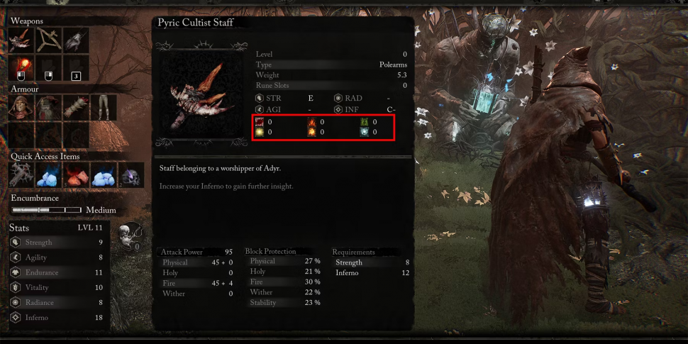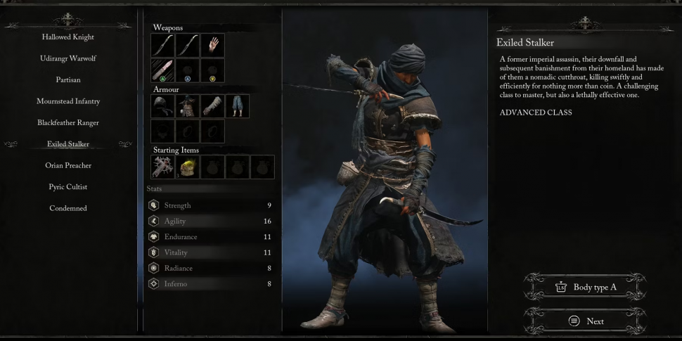 Если игрок не может определиться с тем, какой именно показатель следует повысить, лучше всего придерживаться выбранного класса и повышать показатели и навыки, необходимые для развития данного класса. Например, если игрок выбрал класс с легким оружием, как Blackfeather Ranger, то лучше всего сосредоточиться на ловкости и выносливости. Что касается новичков в жанре soulslike, то старайтесь улучшать то, что создает проблему. Например, если HP слишком мало и лампоносцы умирают почти сразу, улучшите Vitality, чтобы увеличить полоску здоровья.