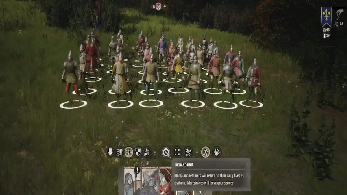 На вкладке «Действия наемников» в Manor Lords есть иконка с надписью «Распустить». Нажмите на нее, и армия исчезнет.