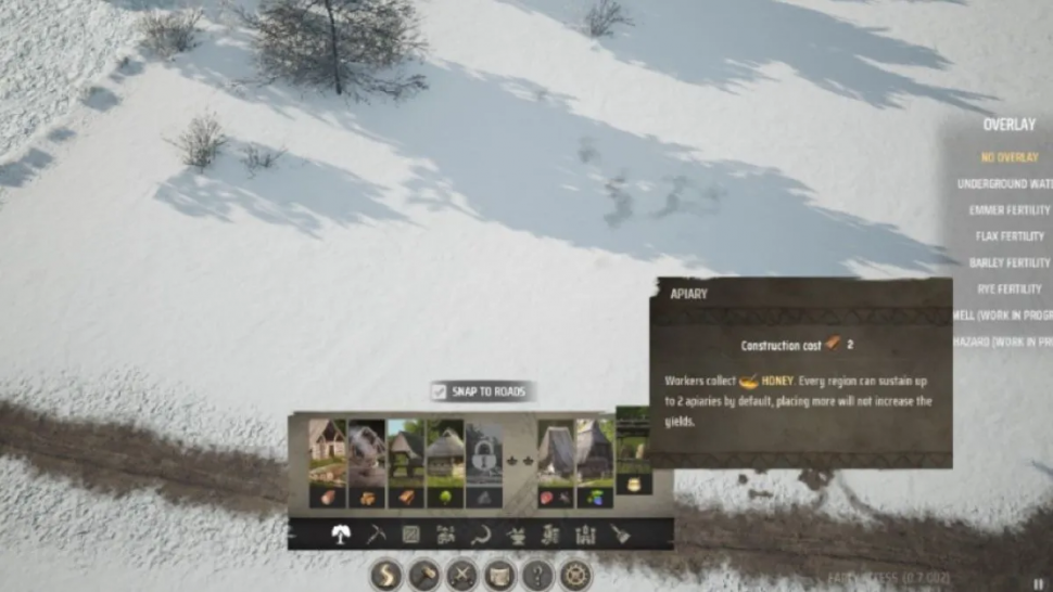 Для строительства каждой пасеки требуется 2 доски. По умолчанию окружающий регион может поддерживать до 2 пасек. Строительство дополнительных пасек сверх этого лимита не приведет к увеличению производства меда. Пасеки имеют 4 слота для работников и не требуют сырья для работы.