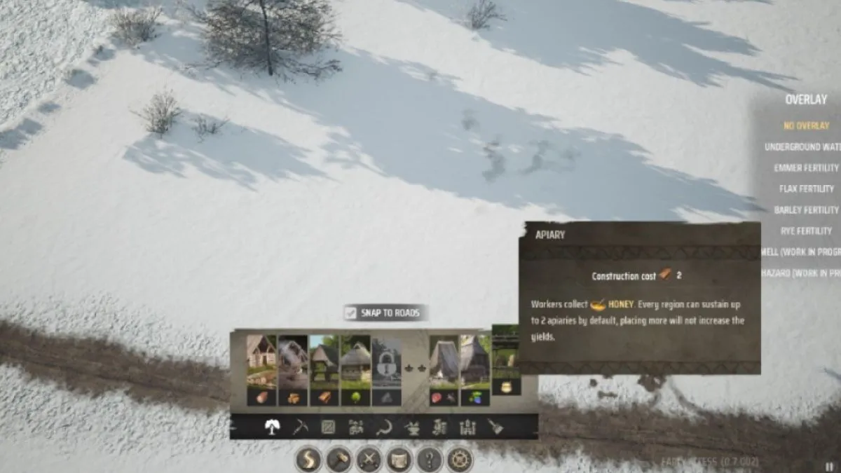 Для строительства каждой пасеки требуется 2 доски. По умолчанию окружающий регион может поддерживать до 2 пасек. Строительство дополнительных пасек сверх этого лимита не приведет к увеличению производства меда. Пасеки имеют 4 слота для работников и не требуют сырья для работы.