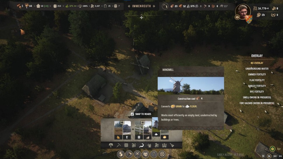 После того как в вашей деревне накопится значительная куча зерна, следующим шагом будет строительство ветряной мельницы. Вам нужно, чтобы на ветряной мельнице работали хотя бы один или два жителя деревни, чтобы превращать зерно в муку, и вы сможете открыть пекарню в деревне, превращая ее в хлеб в Manor Lords. Хлеб - единственное, что вы можете сделать из муки, но вы можете использовать его, чтобы накормить свою деревню и пополнить ее продовольственное разнообразие на рынке или продать его в другие регионы, которые не имеют доступа к этому предмету, пополнив свое региональное богатство.