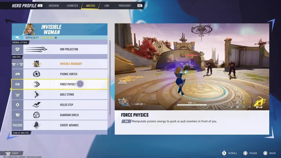 Эта способность предоставляет Невидимой Женщине возможность манипулировать пространством вокруг себя. После активации Физики Силы игрок может выбрать одну из двух опций: толкнуть всех врагов в линии перед собой (используя R2/RT) или, наоборот, притянуть их к себе (используя L2/LT). Обе вариации этой способности служат для управления дистанцией между героем и противниками. Например, если враги начинают приближаться слишком близко, можно использовать толчок, чтобы создать безопасную зону вокруг себя. А если необходимо собрать врагов в одном месте для последующей групповой атаки, можно использовать притяжение. Физика Силы также является отличным средством для создания тактических преимуществ, поскольку позволяет быстро изменять расположение врагов на поле боя, что открывает новые возможности для атак и манёвров.