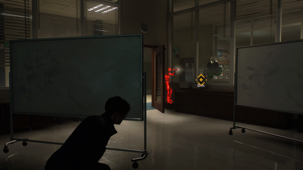 Затем прицельтесь в камеру слева, чтобы она вспыхнула и привлекла внимание другого офиса. И наконец, посмотрите на выдвижные кресла слева и с помощью L1+R1 выдвиньте их, успешно изолировав охранника.