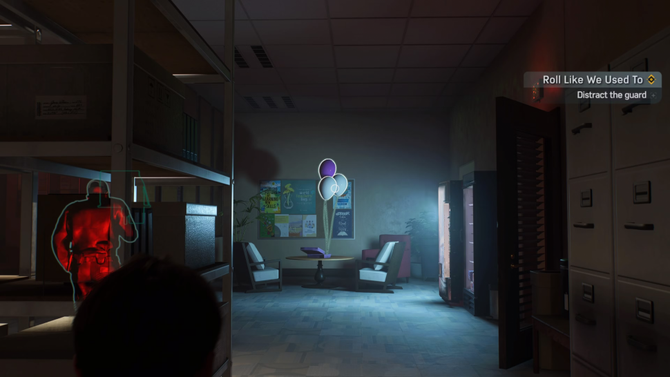 Воссоединившись с Гарри, из лифта выйдет еще один охранник, чтобы проверить, нет ли посторонних. Используйте шарики для отвлечения внимания и двигайтесь к шкафчикам, чтобы забрать флэш-накопитель. Конечно, не все так просто - флешка окажется у охранника, который вызвал полицию.