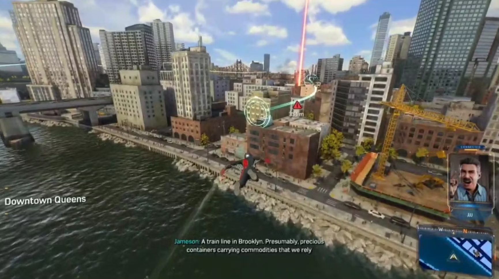 Теперь посмотрите в сторону набережной в Финансовом районе и с помощью R3 просканируйте местность. В результате обнаружится аэродинамическая труба, направленная на восток. Наберите высоту, раскачиваясь или используя заряженный прыжок, а затем нажмите Triangle, чтобы активировать Web Wings. Следуйте по аэродинамической трубе, чтобы безопасно перелететь через воду, и не забудьте подтянуться после активации последнего ускорителя.