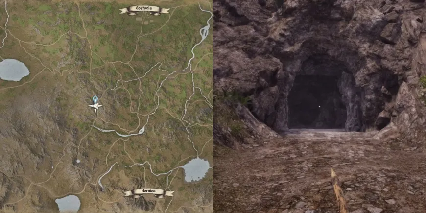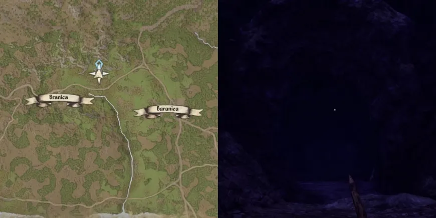 Пещера находится так далеко на западе, что курсор не переместится туда, если только игроки не находятся уже настолько далеко на западе, что при открытии карты курсор начинает перемещаться так далеко. Пещера находится всего в нескольких сотнях метров к югу от Лесницы.