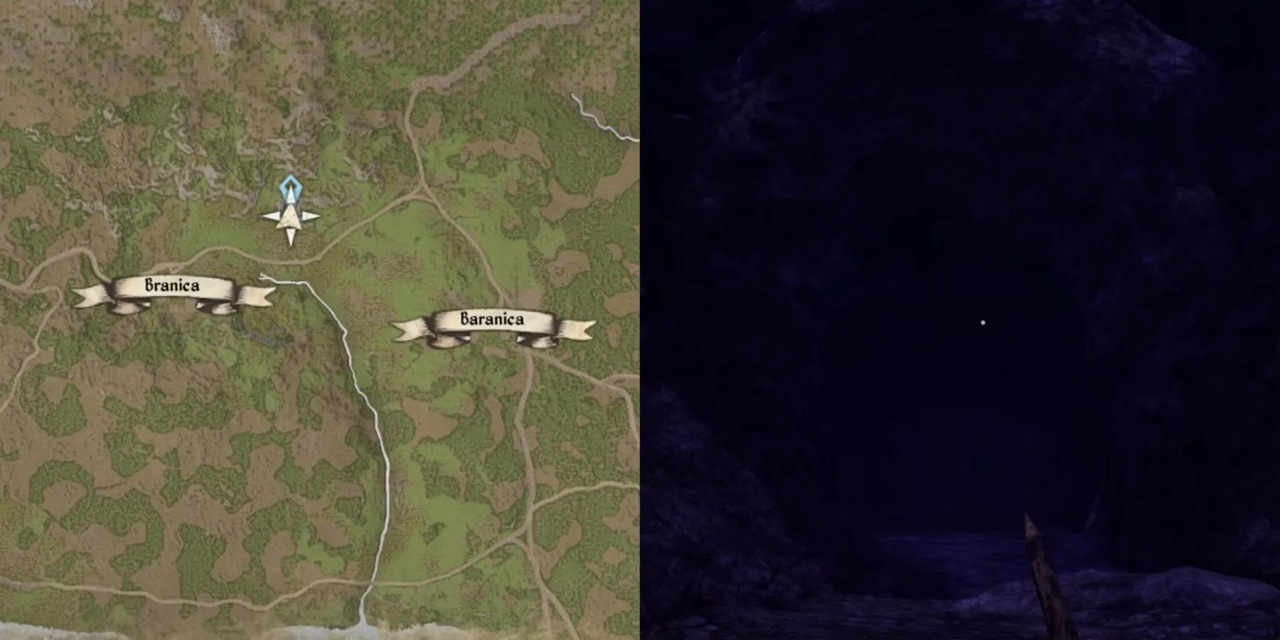 К северу от главной реки есть только одна пещера. Между городами-побратимами Браница и Бараница на самом северном краю карты находится пещера. Река не настолько велика, чтобы ловить рыбу, а два города расположены довольно близко, но небольшое поселение могло бы хорошо разрабатывать эту пещеру. Пусть жители будут довольны и работают.