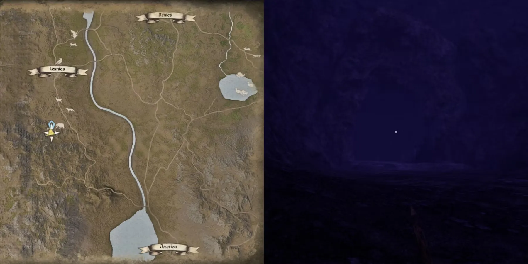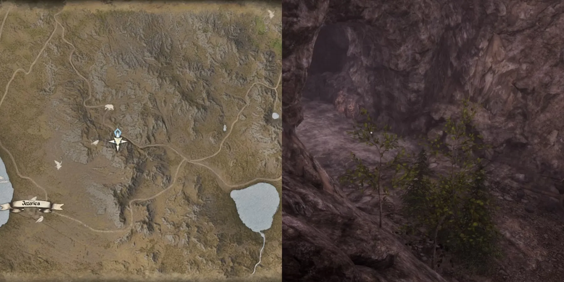 Пещера находится так далеко на западе, что курсор не переместится туда, если только игроки не находятся уже настолько далеко на западе, что при открытии карты курсор начинает перемещаться так далеко. Пещера находится всего в нескольких сотнях метров к югу от Лесницы.