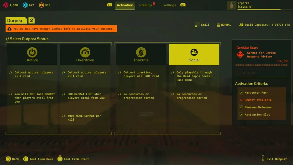 Следует отметить, что аванпосты, переведенные в социальный статус, не извлекают GenMat и не появляются на стандартной карте рейда. Это означает, что игроки не будут зарабатывать материалы и прогрессию в Meet Your Maker за уровни с социальным статусом, и им следует обязательно вернуться на свои аванпосты и переключить их обратно в активный режим, когда их друзья завершат их. Хотя это может доставить некоторые неудобства, они незначительны, поскольку игроки могут свободно менять статус аванпоста, когда захотят.