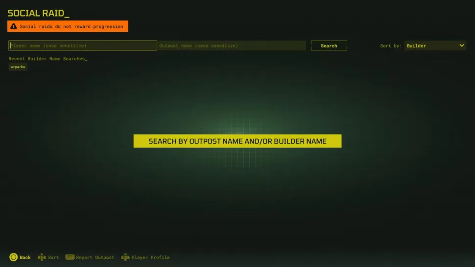В этот момент рейдеру следует взаимодействовать с командным центром своего Убежища и нажать на кнопку "социальный рейд", которая указана в нижней части карты рейда. Это приведет рейдеров к новому меню, в котором они смогут искать уровни либо по имени игрока, либо по имени аванпоста, и, действительно, они смогут найти базу своего друга, выполнив соответствующий поиск. Однако игрокам Meet Your Maker необходимо проявлять некоторую осторожность при выполнении подобных поисков, поскольку заглавные буквы имеют значение.
