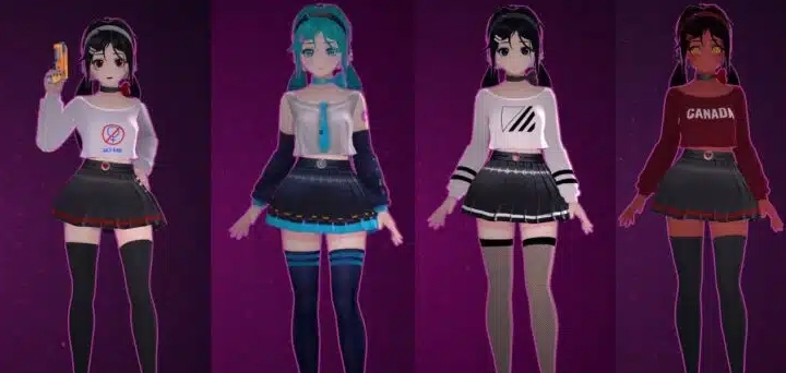 На момент релиза игры в игре имеются 4 костюма: оригинальный, школьный, вампирский и рождественский. Что примечательно, у каждого наряда есть несколько расцветок, так что вы сможете сделать свою возлюбленную по-настоящему шикарной.