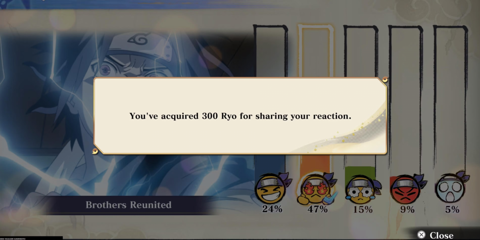 После завершения каждого боя в сюжетном режиме игроку будет предложено отреагировать на него. Это можно сделать с помощью D-Pad или аналогового стика, а затем нажать кнопку Triangle/Y. За каждую реакцию игроки получат 300 Ryo. Кроме того, игроки могут получать Ryo за повышение уровня мастерства персонажа. Это можно сделать, выполняя различные миссии, начиная от использования персонажа определенное количество раз и заканчивая выполнением секретных техник.