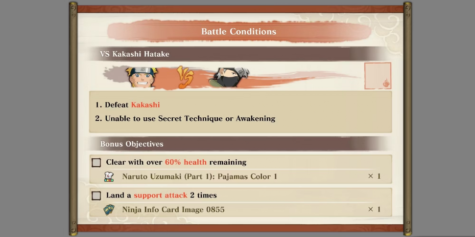 Пижаму Наруто (часть 1) можно разблокировать, выполнив первую бонусную цель, которая заключается в прохождении миссии с остатком здоровья более 60 %. Сделать это довольно просто, так как у Какаши минимальное количество здоровья и он не будет сопротивляться так сильно, как противники на более поздних этапах сюжета режима.