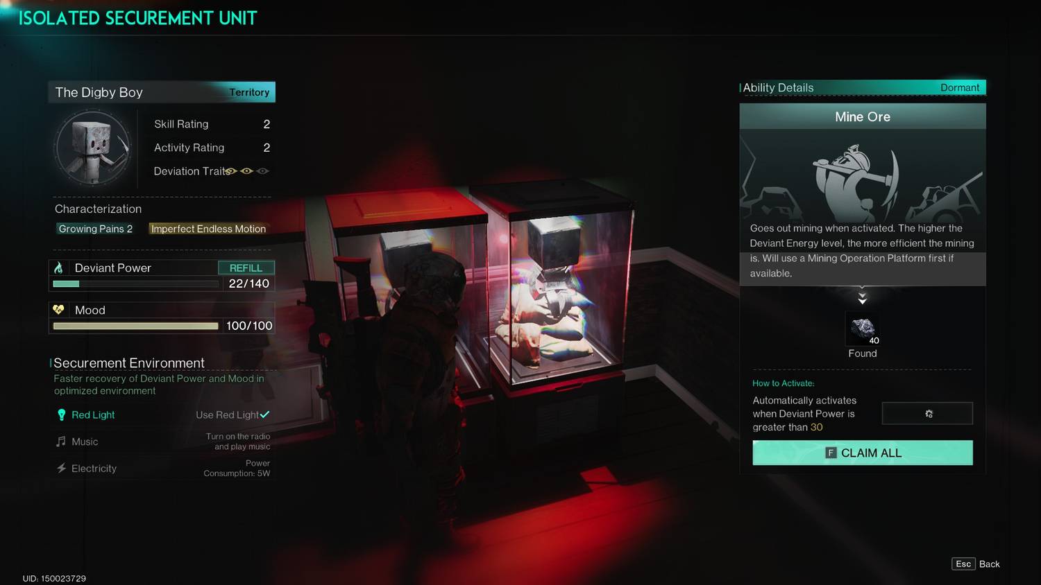 Мальчик Дигби будет автоматически собирать различные минералы до тех пор, пока у него остается хоть немного девиантской силы. Как только он устанет, он будет спокойно подзаряжаться в своем блоке безопасности, пока не достигнет определенного уровня Силы девианта. Вы можете установить этот уровень, нажав на маленький значок шестеренки в правой части экрана при осмотре блока сдерживания девианта.