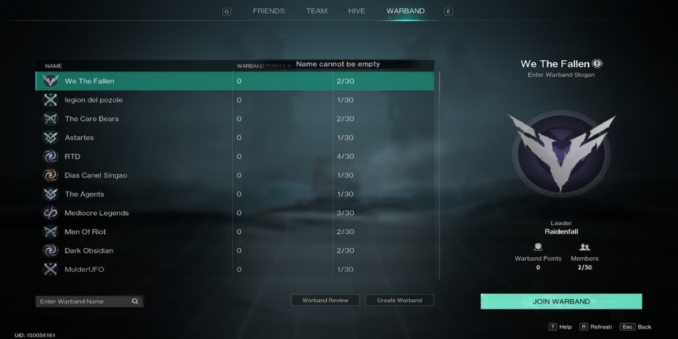 Меню участников позволяет игрокам видеть профили всех участников Warband, их рейтинг в Варбэнде и находятся ли они в сети или нет. Это меню также дает игрокам возможность покинуть Отряд, удерживая "Z" . |