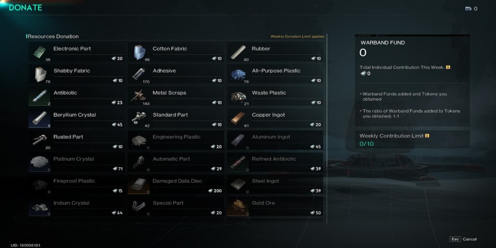 В меню «Обзор» слева внизу будет опция «Пожертвовать в фонд Варбэнду». Игроки могут пожертвовать десять предметов еженедельно, чтобы заработать кредиты Warband . |
