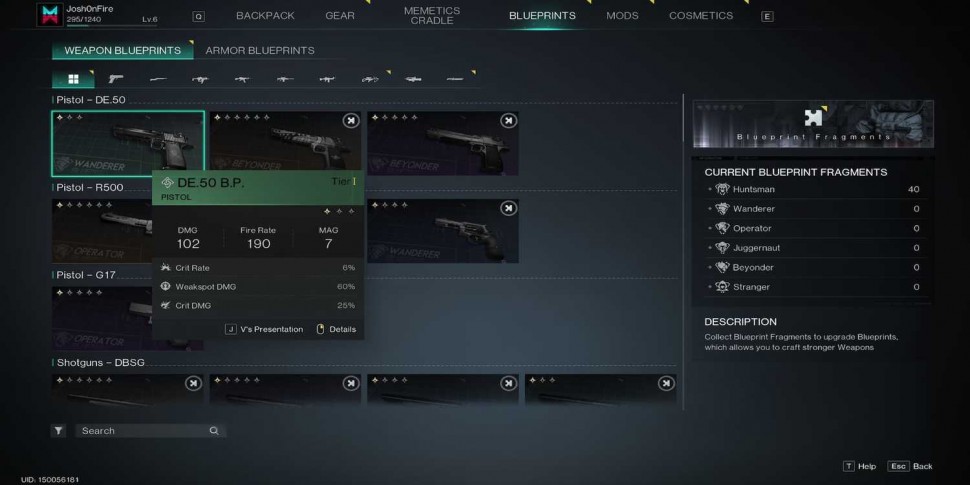 При наличии только этих меметических улучшений игроки смогут создать только базовый пистолет. Получение обновлений Basic Gear и Long-Range Firepower позволит создавать почти все виды оружия, но только базовые версии. Чертежи оружия более высокой редкости существуют, но для создания более мощного оружия игрокам придется исследовать и находить фрагменты чертежей.