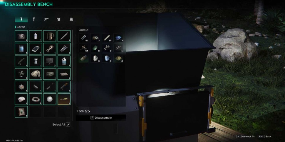 Для изготовления оружия всех типов и уровней требуются разные материалы. Чаще всего материалы для изготовления оружия можно получить, исследуя и грабя отбросы в кишащих монстрами строениях, встречающихся по всему миру. Обрезки - это случайные предметы, такие как чашки, поршни, старые части оружия и любые другие вещи, которые можно подобрать во время исследования. Хотя обрезки можно найти случайно, многие из них находятся в сундуках и мусорных баках. Чтобы построить скамью для разборки, игрокам также потребуется получить апгрейд "Техника разборки" из дерева апгрейдов "Инфраструктурный меметик".