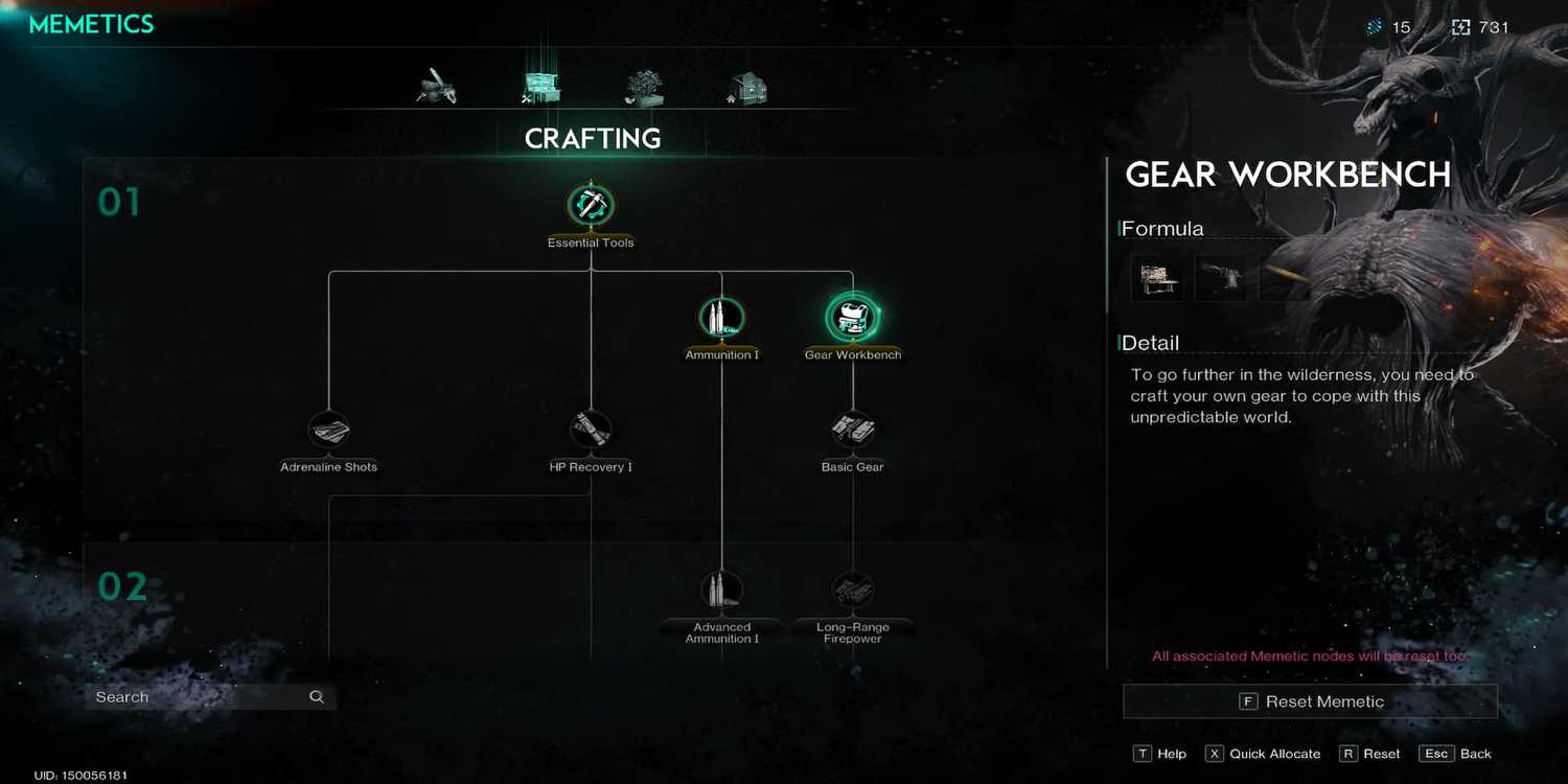 Для создания оружия необходимо зайти в дерево ремесла в меню Memetics и выбрать апгрейд Essential Tools, а затем Gear Workbench. Второе обновление даст игрокам возможность построить Gear Workbench, где, собственно, и создается оружие. Взаимодействуя с Gear Workbench, игроки смогут выбирать, какое оружие они хотят создать и какого уровня. Оружие более высокого уровня требует более редких материалов, но наносит более высокий базовый урон.