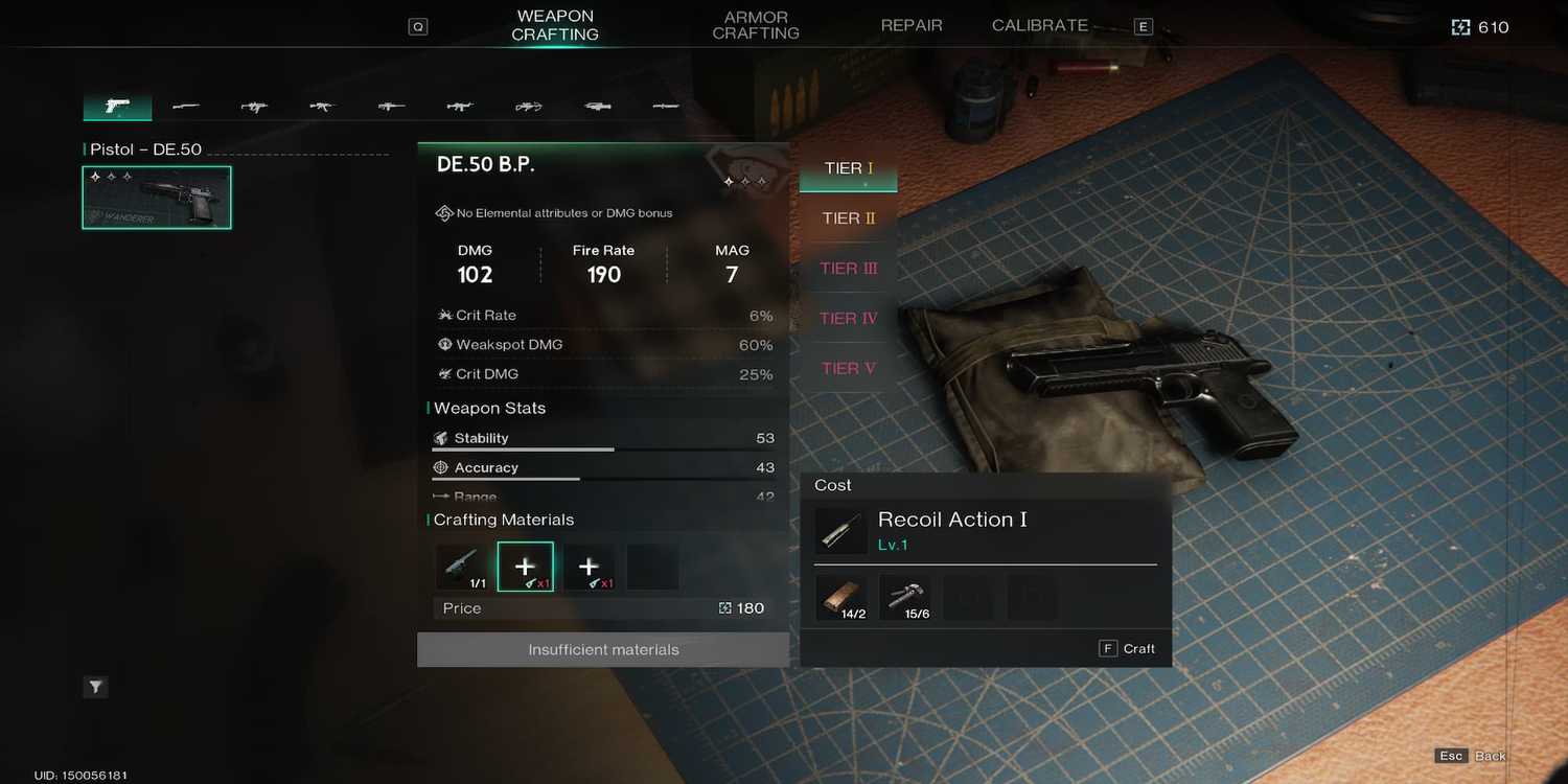 При наличии только этих меметических улучшений игроки смогут создать только базовый пистолет. Получение обновлений Basic Gear и Long-Range Firepower позволит создавать почти все виды оружия, но только базовые версии. Чертежи оружия более высокой редкости существуют, но для создания более мощного оружия игрокам придется исследовать и находить фрагменты чертежей.